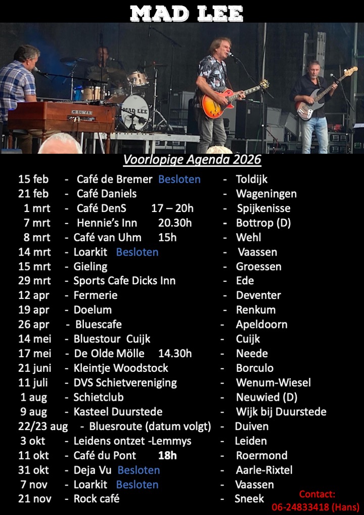 Kijk op https://madlee.nl voor de meest recente agenda.